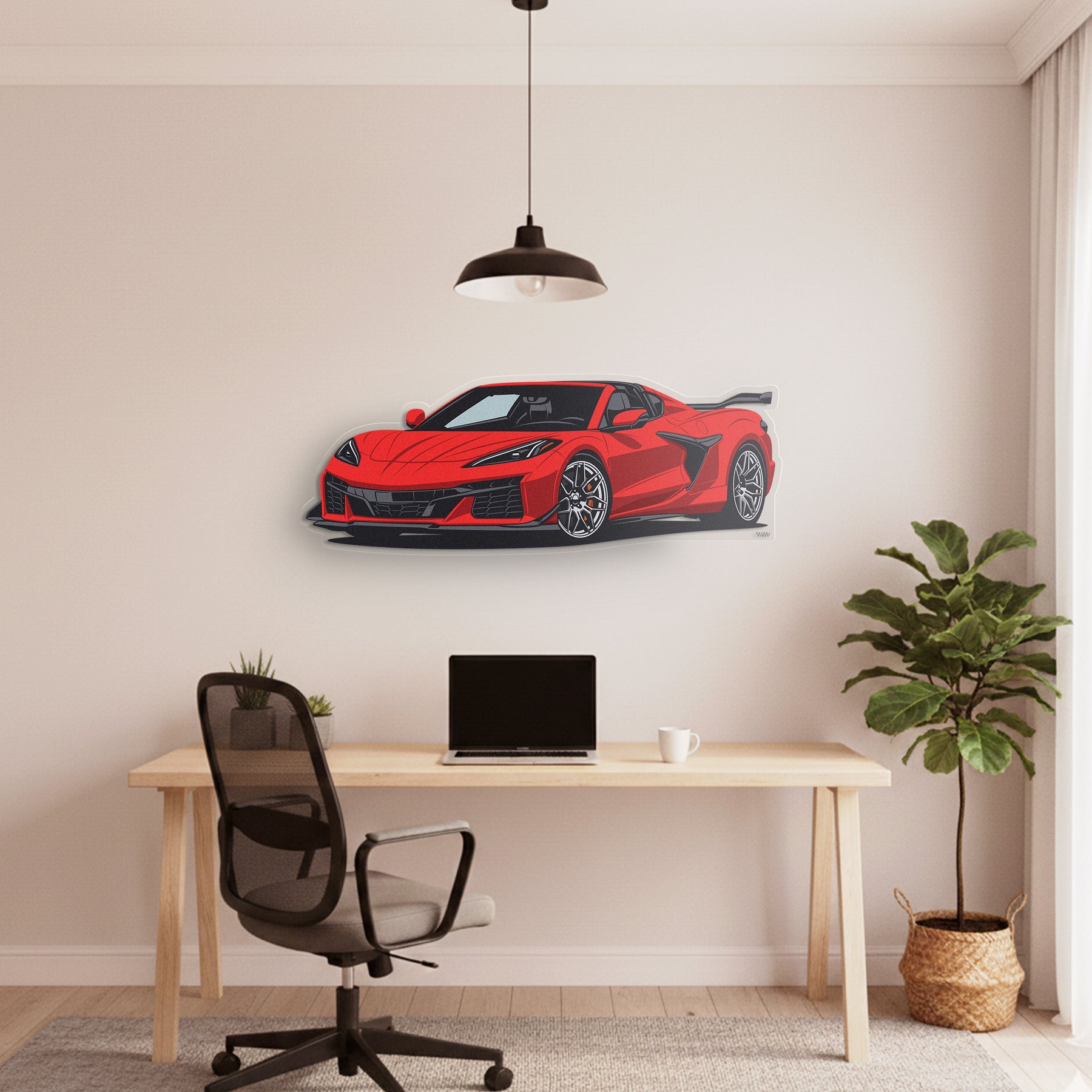 This eye-catching Corvette C8 Z06 Front Angle Acrylic Print will add a touch of vibrancy and elegance to your room, office, or garage, and will catch the attention of any racing or car enthusiast.