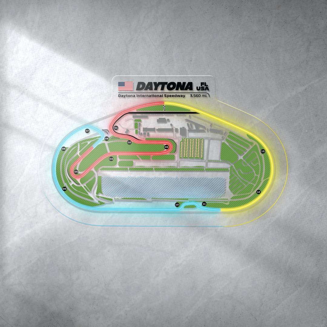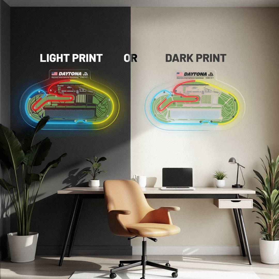 This Daytona International Speedway Neon Race Track silhouette will add a bright spark of light to any room. Each track features the 3 iconic colors of Formula 1, the race track name alongside the distance and the country it's located in. It's the perfect way to add some color and improve the overall look while catching the attention of anyone, racing enthusiast or not.