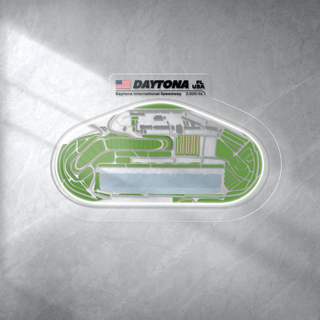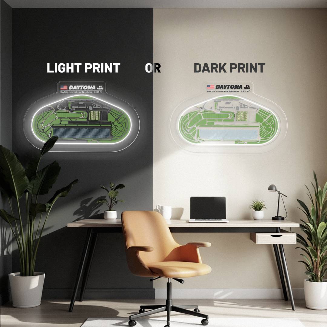 This Daytona International Speedway Oval Neon Race Track silhouette will add a bright spark of light to any room. Each track features the 3 iconic colors of Formula 1, the race track name alongside the distance and the country it's located in. It's the perfect way to add some color and improve the overall look while catching the attention of anyone, racing enthusiast or not.