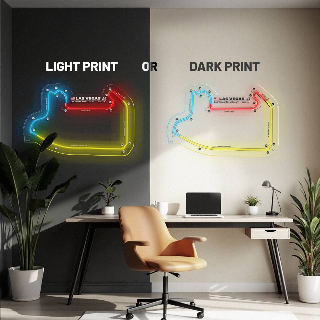 This Las Vegas Strip Circuit Neon Race Track silhouette will add a bright spark of light to any room. Each track features the 3 iconic colors of Formula 1, the race track name alongside the distance and the country it's located in. It's the perfect way to add some color and improve the overall look while catching the attention of anyone, racing enthusiast or not.