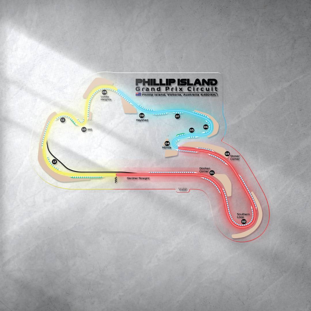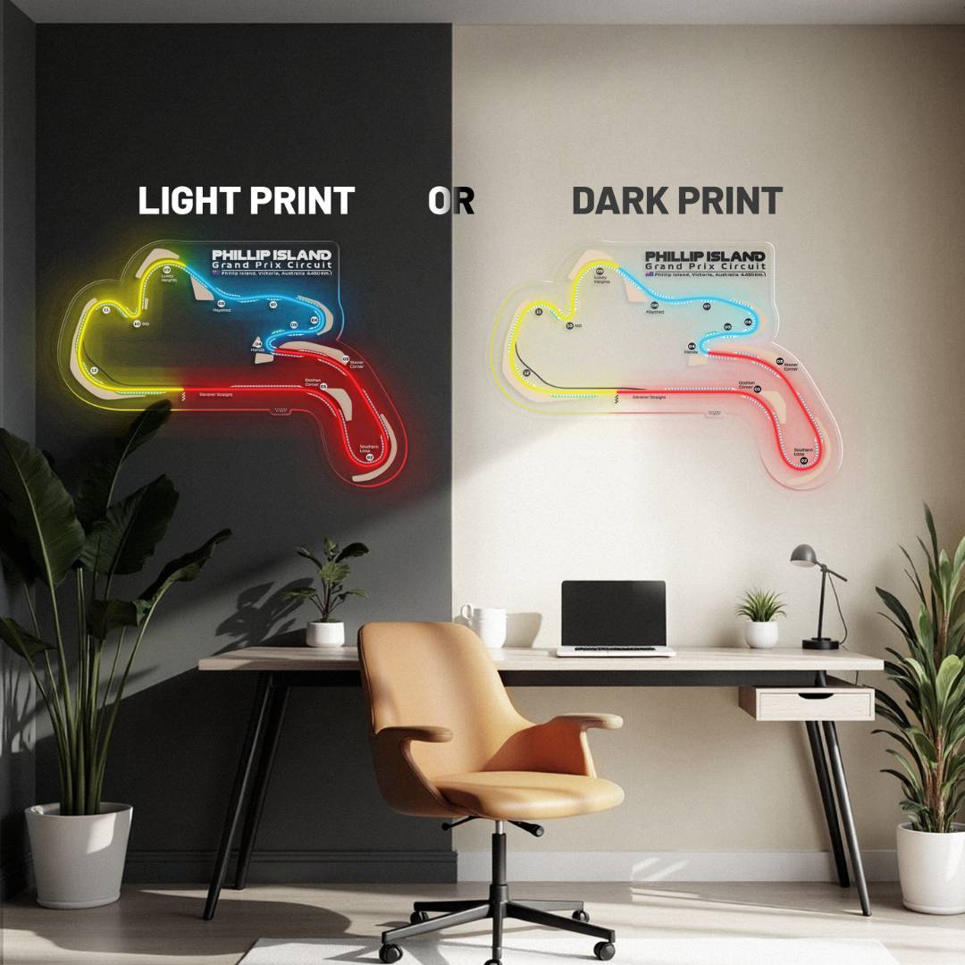 This Phillip Island Grand Prix Circuit Neon Race Track silhouette will add a bright spark of light to any room. Each track features the 3 iconic colors of Formula 1, the race track name alongside the distance and the country it's located in. It's the perfect way to add some color and improve the overall look while catching the attention of anyone, racing enthusiast or not.