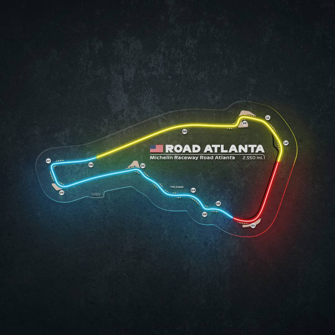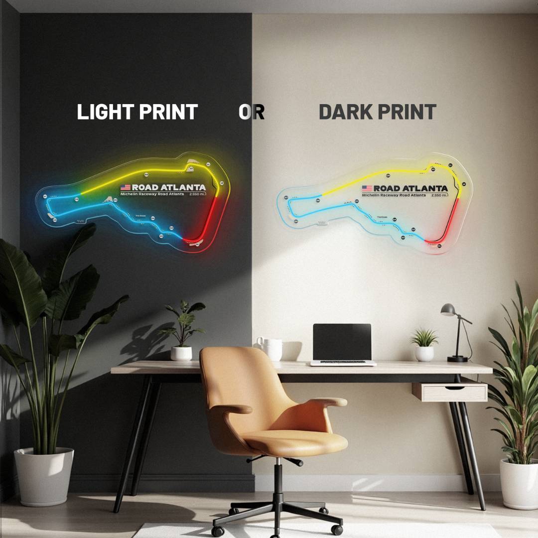 This Road Atlanta Neon Race Track silhouette will add a bright spark of light to any room. Each track features the 3 iconic colors of Formula 1, the race track name alongside the distance and the country it's located in. It's the perfect way to add some color and improve the overall look while catching the attention of anyone, racing enthusiast or not.