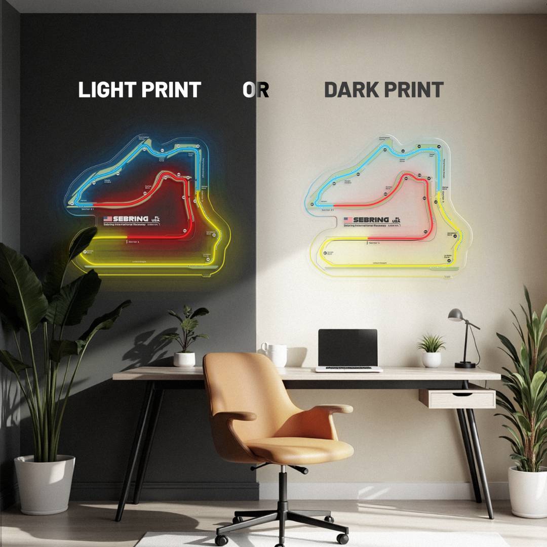 This Sebring International Raceway Neon Race Track silhouette will add a bright spark of light to any room. Each track features the 3 iconic colors of Formula 1, the race track name alongside the distance and the country it's located in. It's the perfect way to add some color and improve the overall look while catching the attention of anyone, racing enthusiast or not.