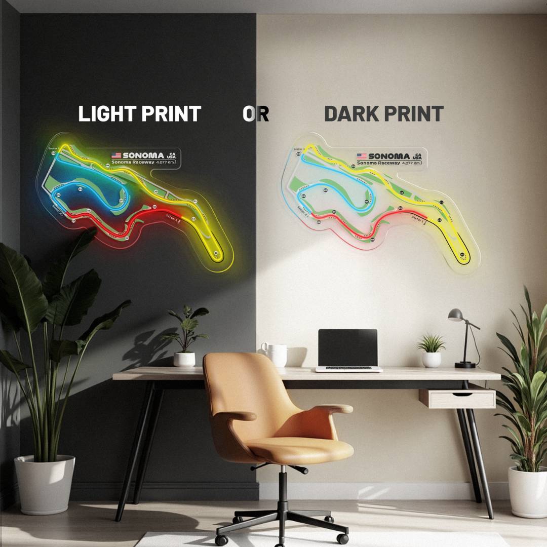 This Sonoma Raceway Neon Race Track silhouette will add a bright spark of light to any room. Each track features the 3 iconic colors of Formula 1, the race track name alongside the distance and the country it's located in. It's the perfect way to add some color and improve the overall look while catching the attention of anyone, racing enthusiast or not.