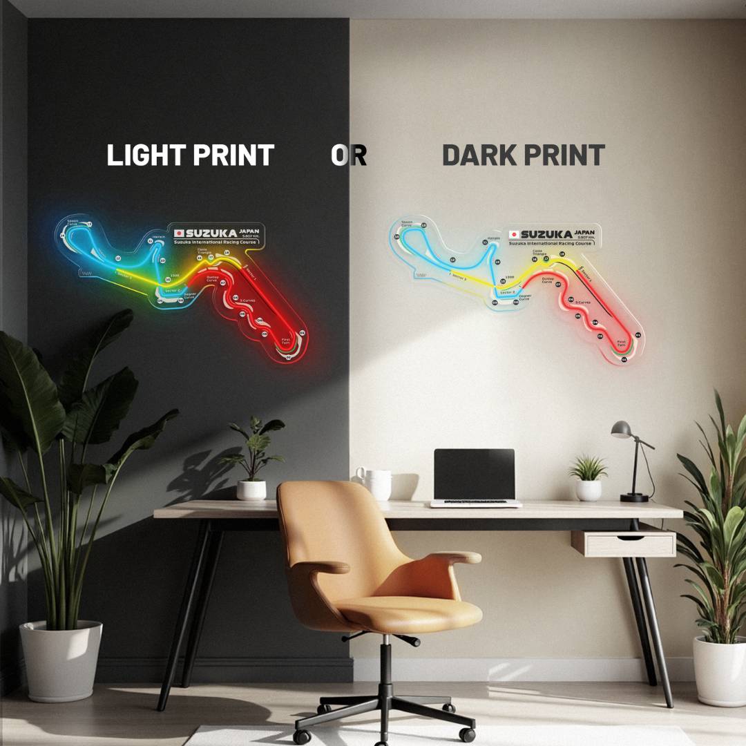 This Suzuka International Racing Course Neon Race Track silhouette will add a bright spark of light to any room. Each track features the 3 iconic colors of Formula 1, the race track name alongside the distance and the country it's located in. It's the perfect way to add some color and improve the overall look while catching the attention of anyone, racing enthusiast or not.