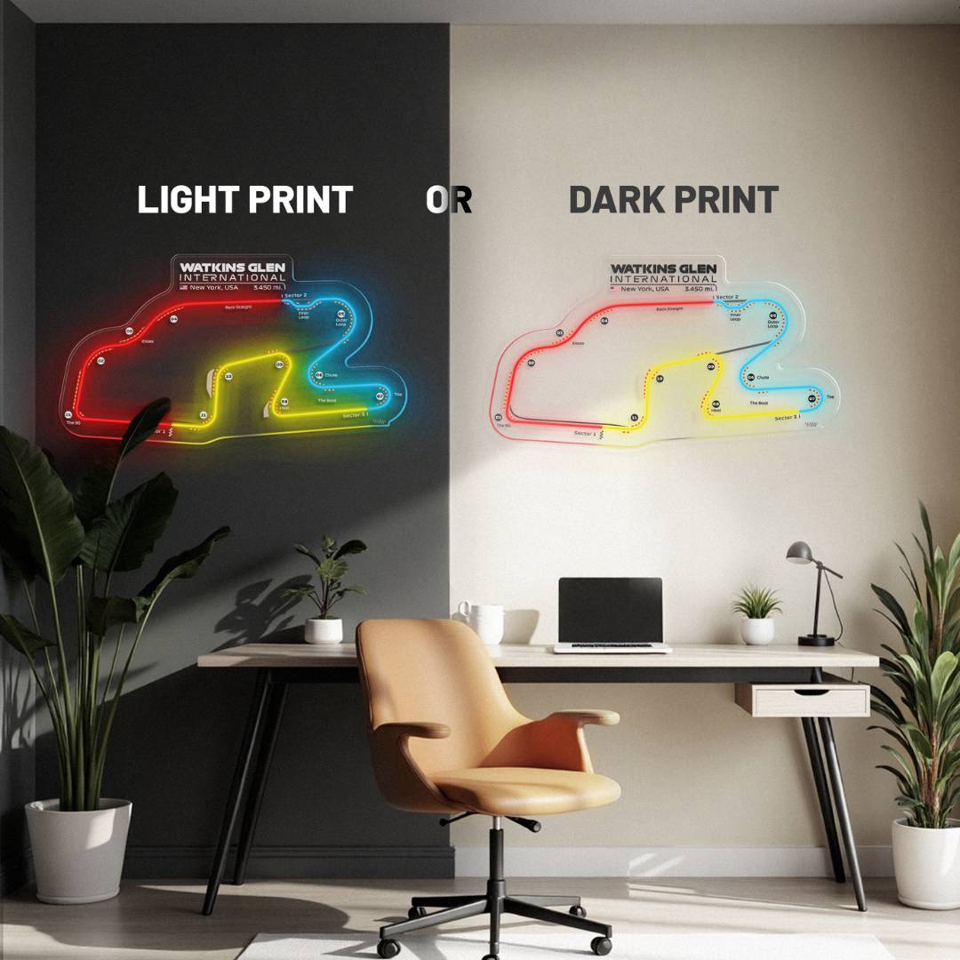 This Watkins Glen International Neon Race Track silhouette will add a bright spark of light to any room. Each track features the 3 iconic colors of Formula 1, the race track name alongside the distance and the country it's located in. It's the perfect way to add some color and improve the overall look while catching the attention of anyone, racing enthusiast or not.