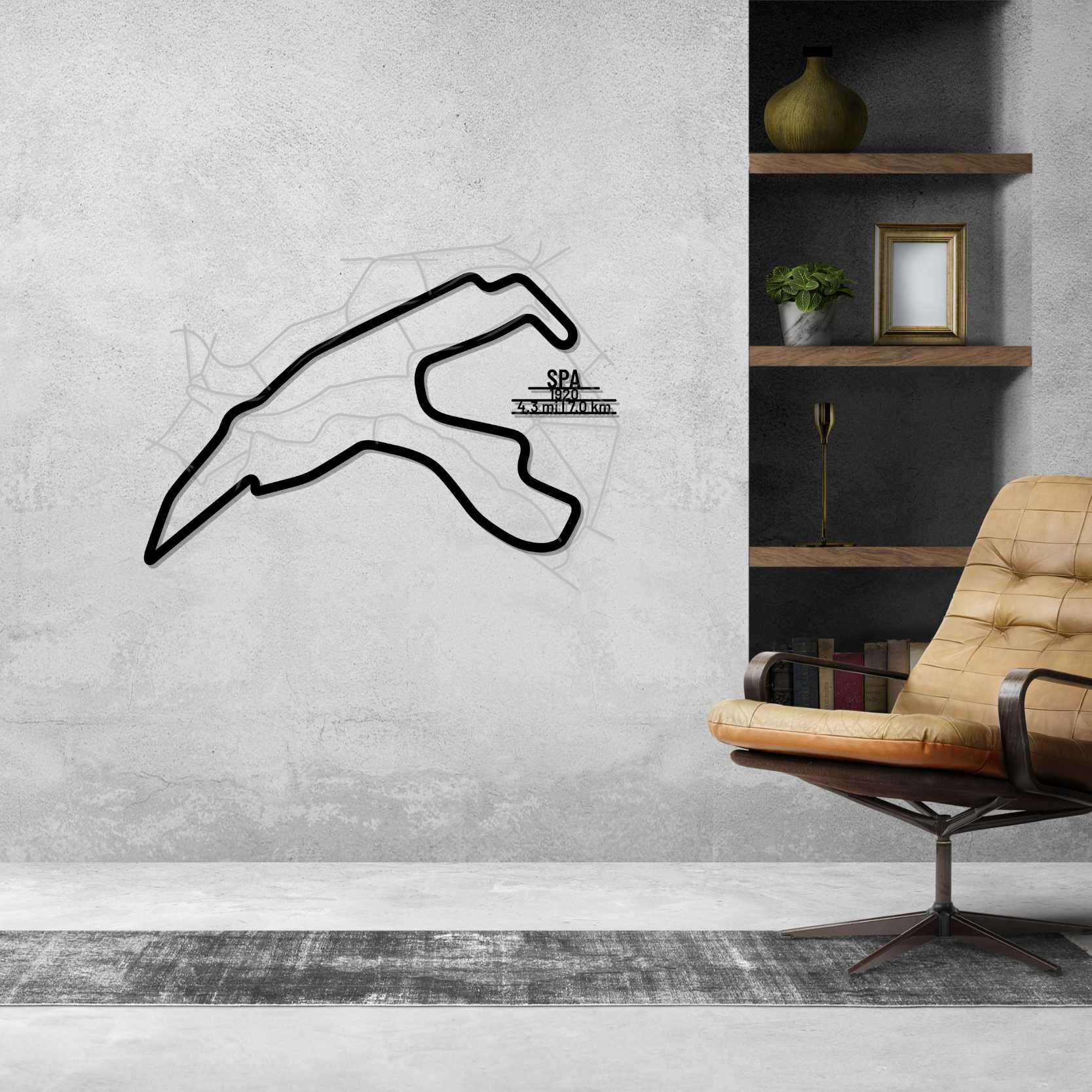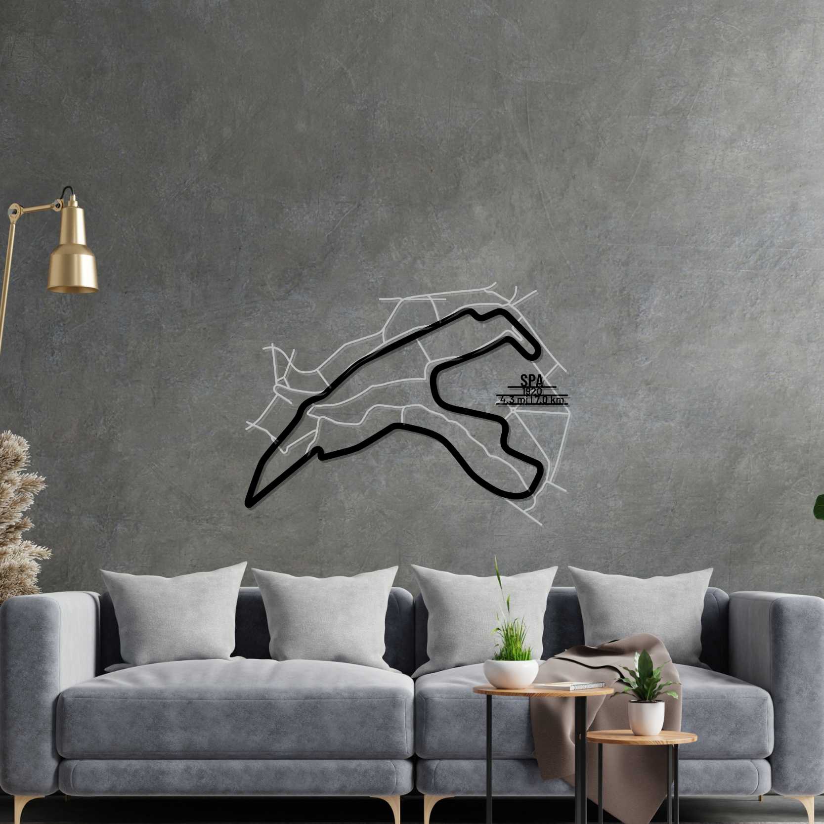 This Circuit de Spa metal Silhouette is our first multilayer and multicolor 3 piece wall art. It includes the track in our classic black finish and the surrounding area in a shiny and sparkly gray color. To top it off, we attach a metal plate, with the name of the track, its distance and the date of construction. This masterpiece alone or in combination with any of our other products will give your office, room or garage a unique look that will catch the attention of any racing or car enthusiast and will add a subtle touch as well motorsport spirit to your home's interior design.
