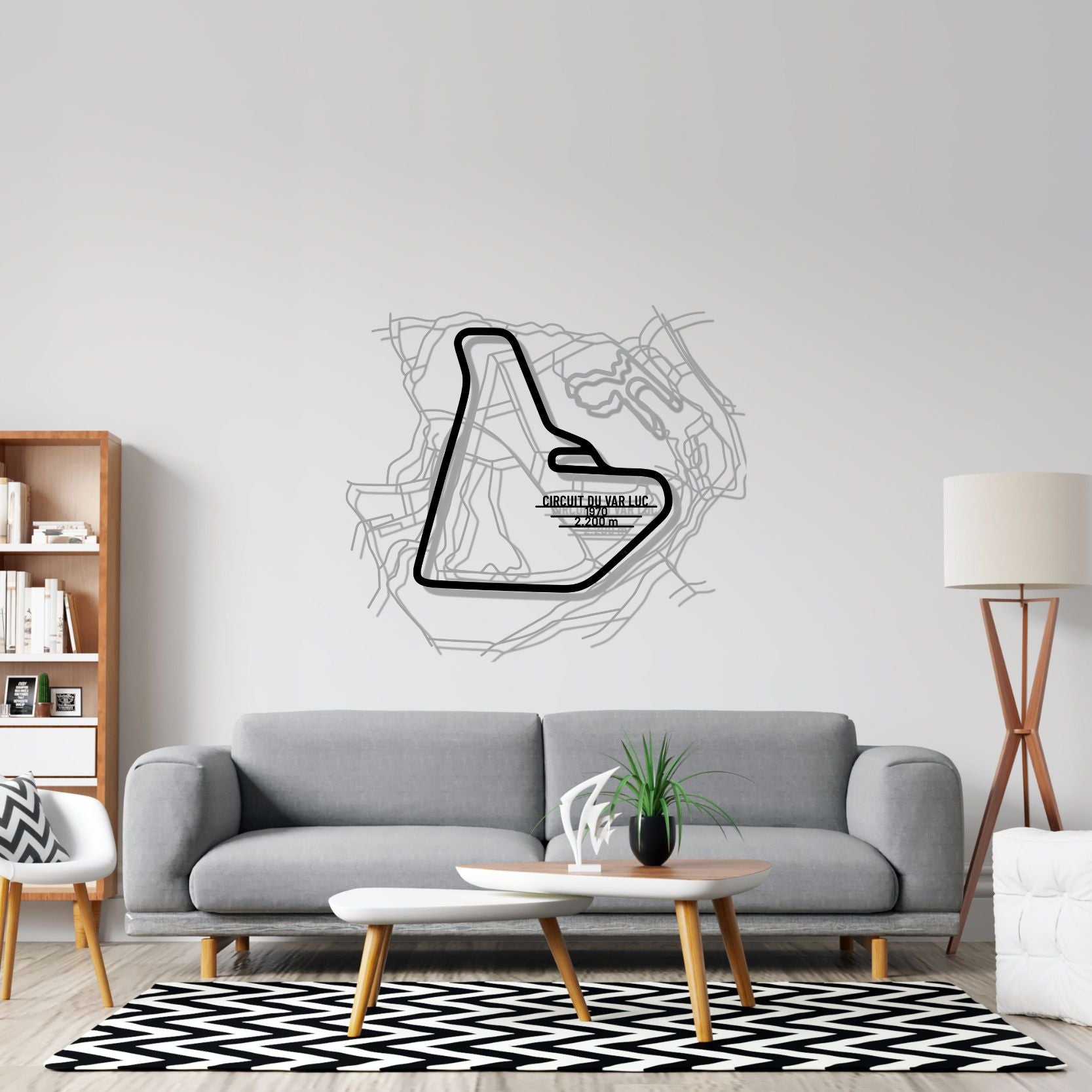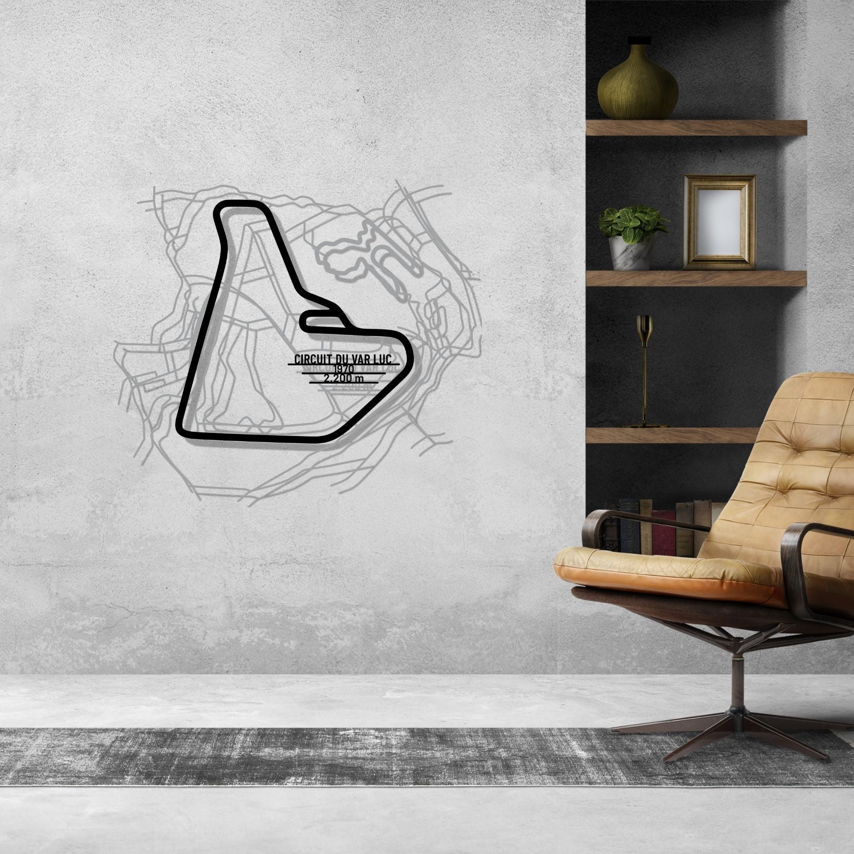 This Circuit Du Var Luc metal Silhouette is our first multilayer and multicolor 3 piece wall art. It includes the track in our classic black finish and the surrounding area in a shiny and sparkly gray color. To top it off, we attach a metal plate, with the name of the track, its distance and the date of construction. This masterpiece alone or in combination with any of our other products will give your office, room or garage a unique look that will catch the attention of any racing or car enthusiast and will add a subtle touch as well motorsport spirit to your home's interior design.
