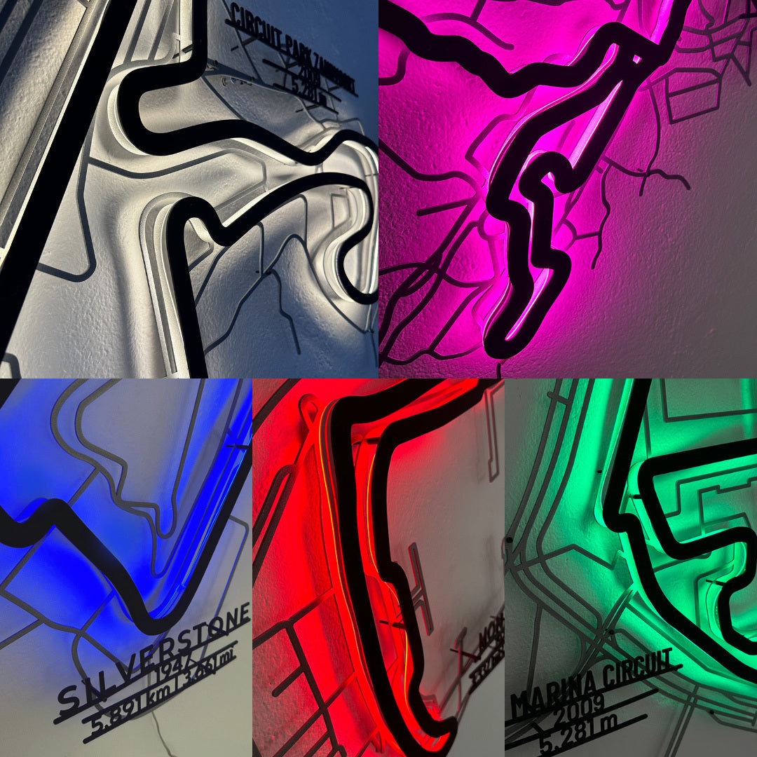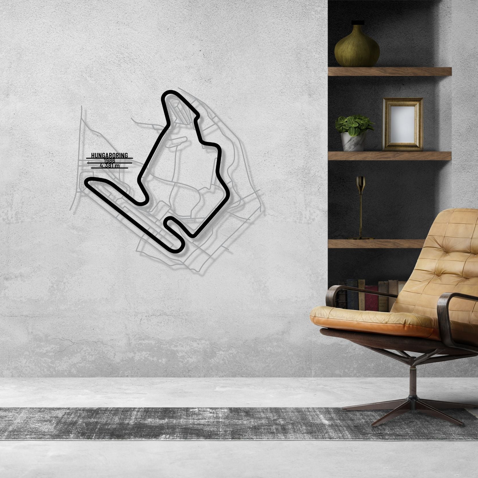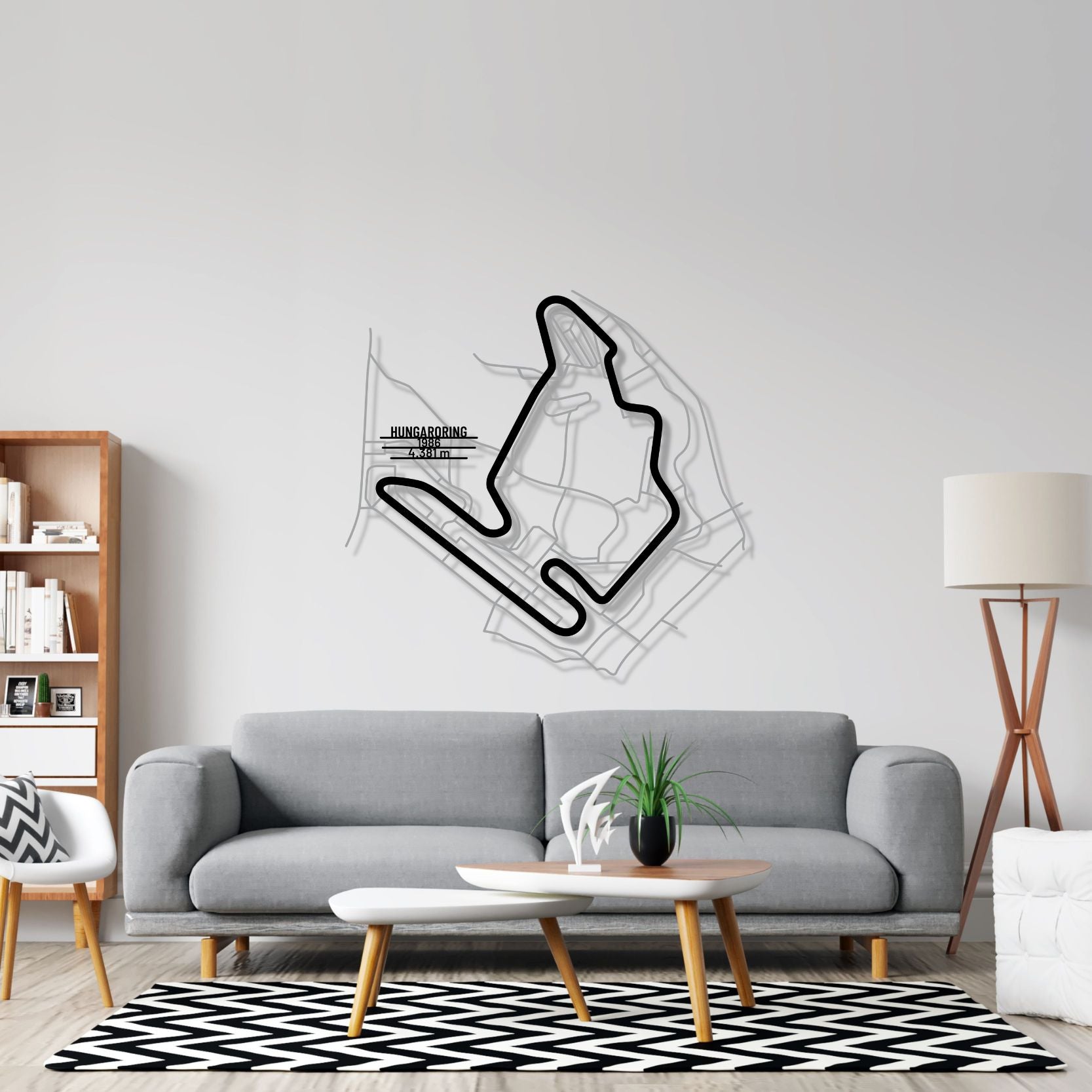 This Hungaroring metal Silhouette is our first multilayer and multicolor 3 piece wall art. It includes the track in our classic black finish and the surrounding area in a shiny and sparkly gray color. To top it off, we attach a metal plate, with the name of the track, its distance and the date of construction. This masterpiece alone or in combination with any of our other products will give your office, room or garage a unique look that will catch the attention of any racing or car enthusiast and will add a subtle touch as well motorsport spirit to your home's interior design.