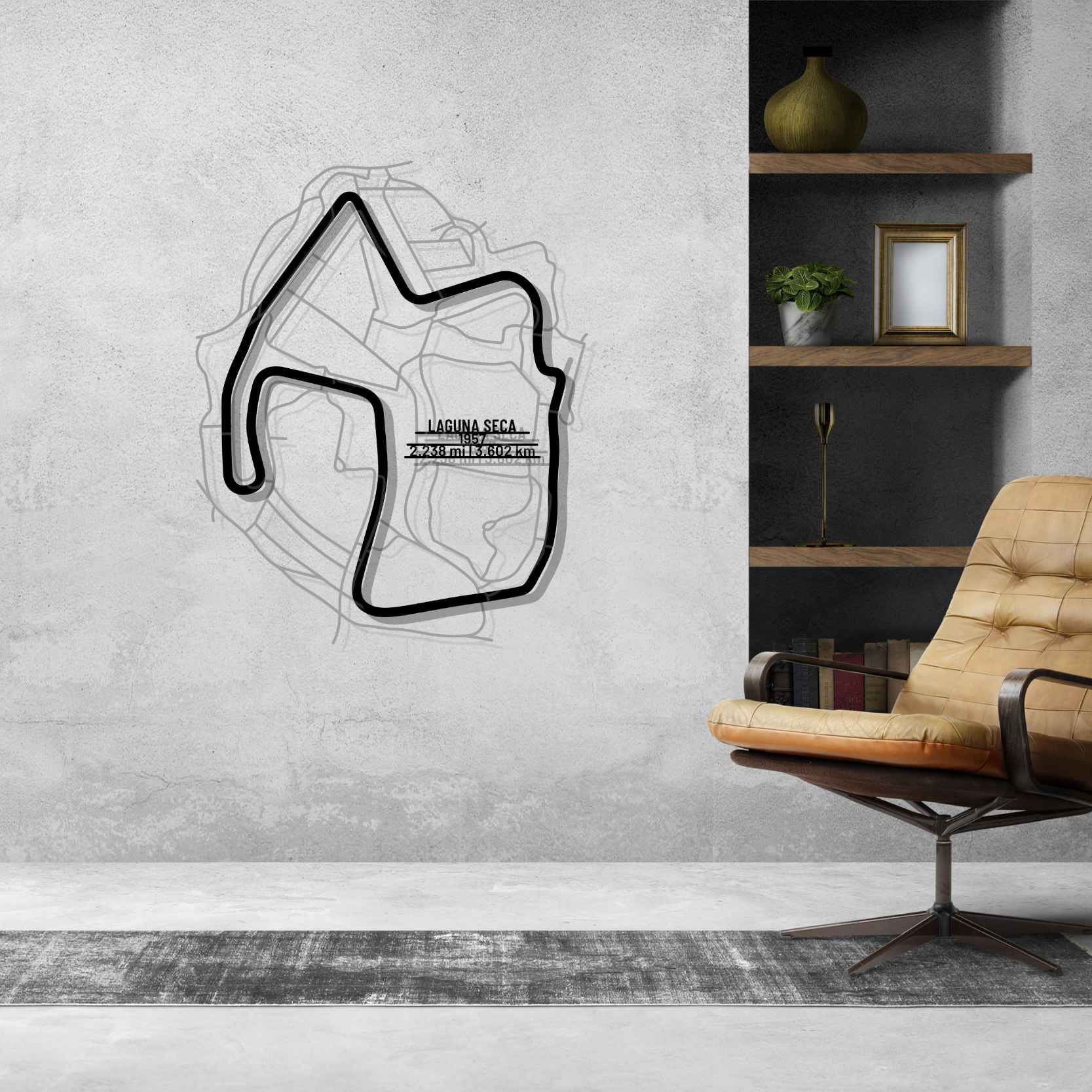 This Laguna Seca metal Silhouette is a multilayer and multicolor 3 piece wall art. It includes the track in our classic black finish and the surrounding area in a shiny and sparkly gray color. To top it off, we attach a metal plate, with the name of the track, its distance and the date of construction. This masterpiece alone or in combination with any of our other products will give your office, room or garage a unique look that will catch the attention of any racing or car enthusiast and will add a subtle touch as well motorsport spirit to your home's interior design.
