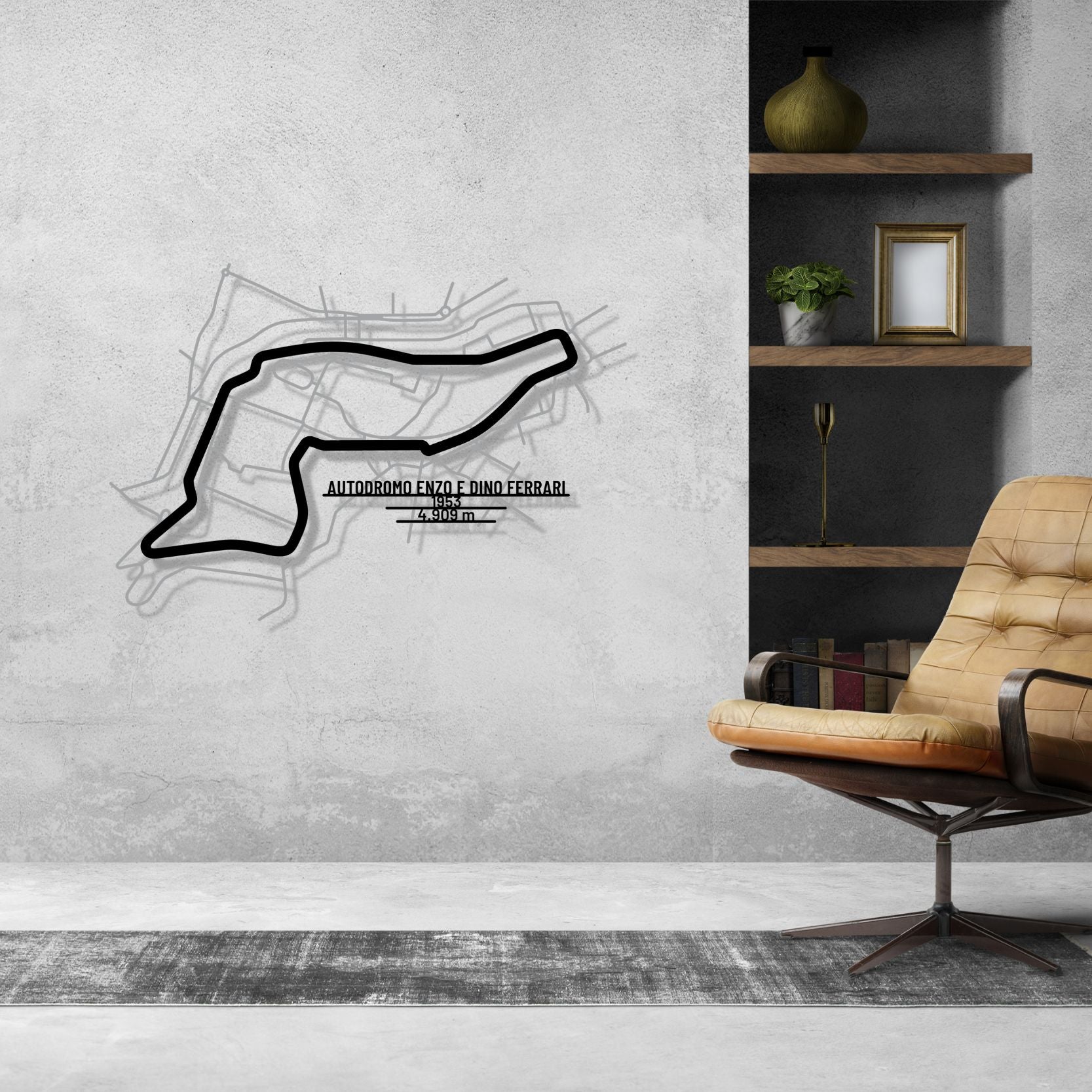 This Autodromo Enzo e Dino Ferrari metal Silhouette is our first multilayer and multicolor 3 piece wall art. It includes the track in our classic black finish and the surrounding area in a shiny and sparkly gray color. To top it off, we attach a metal plate, with the name of the track, its distance and the date of construction. This masterpiece alone or in combination with any of our other products will give your office, room or garage a unique look that will catch the attention of any racing or car enthusiast and will add a subtle touch as well motorsport spirit to your home's interior design.