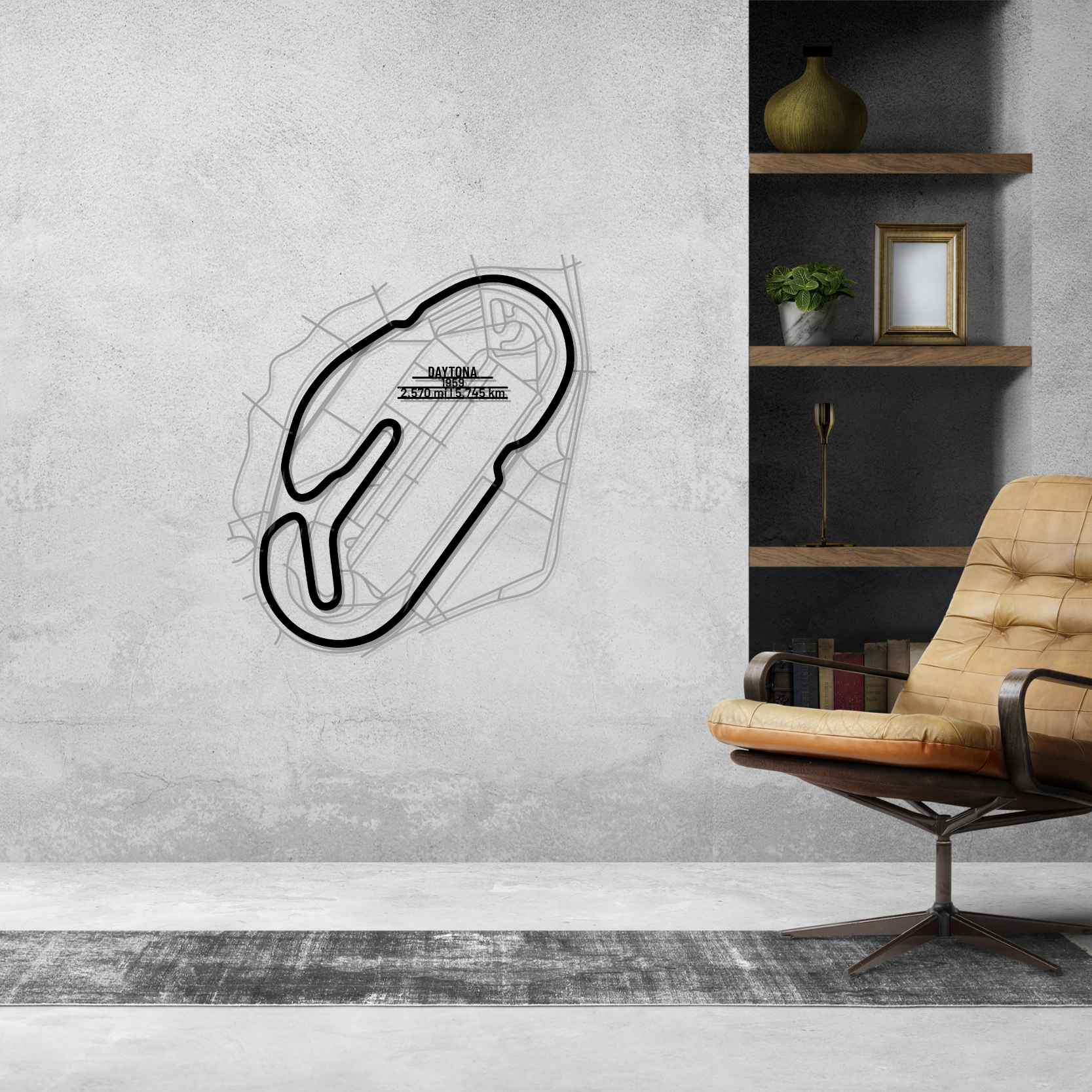 This Daytona metal Silhouette is a multilayer and multicolor 3 piece wall art. It includes the track in our classic black finish and the surrounding area in a shiny and sparkly gray color. To top it off, we attach a metal plate, with the name of the track, its distance and the date of construction. This masterpiece alone or in combination with any of our other products will give your office, room or garage a unique look that will catch the attention of any racing or car enthusiast and will add a subtle touch as well  motorsport spirit to your home's interior design.