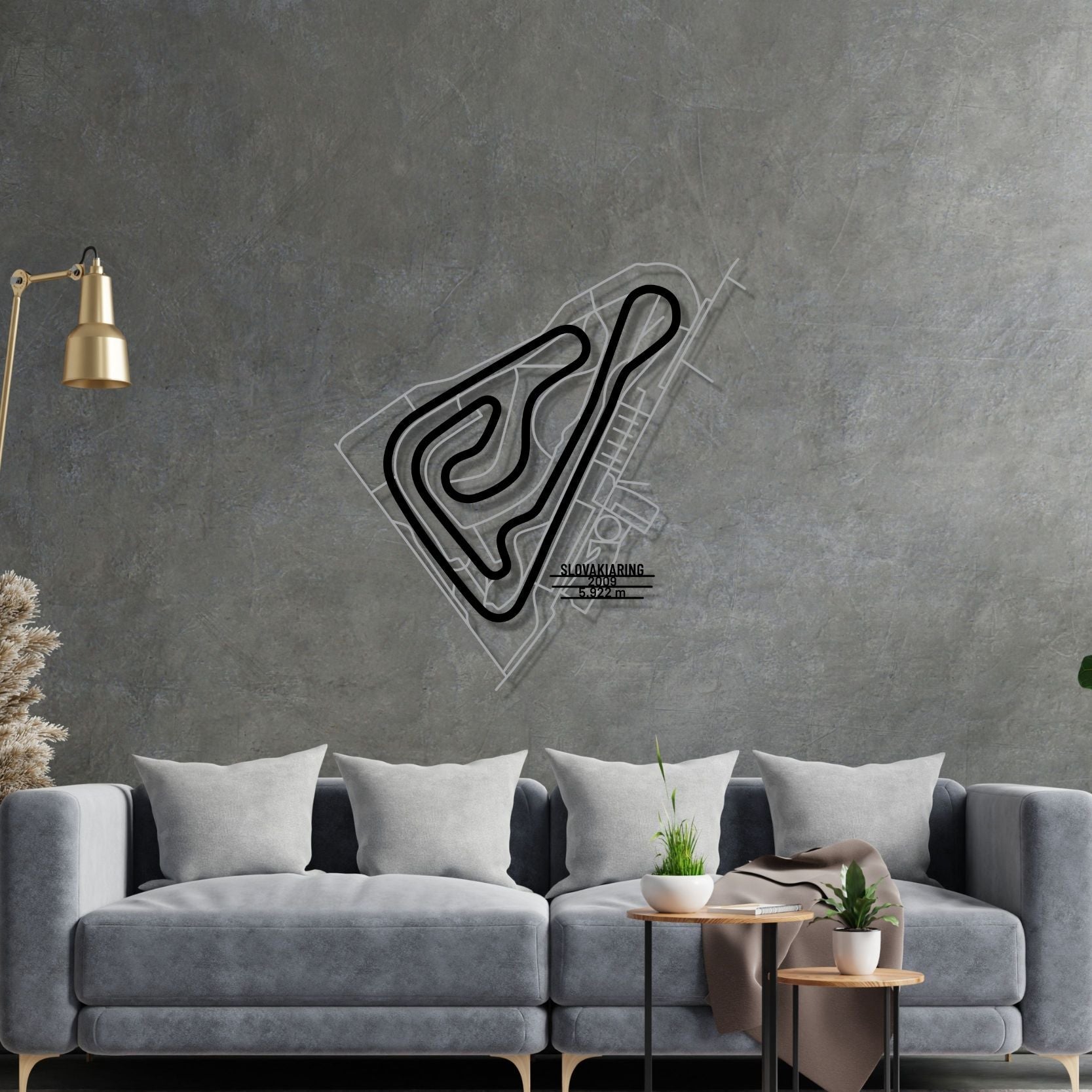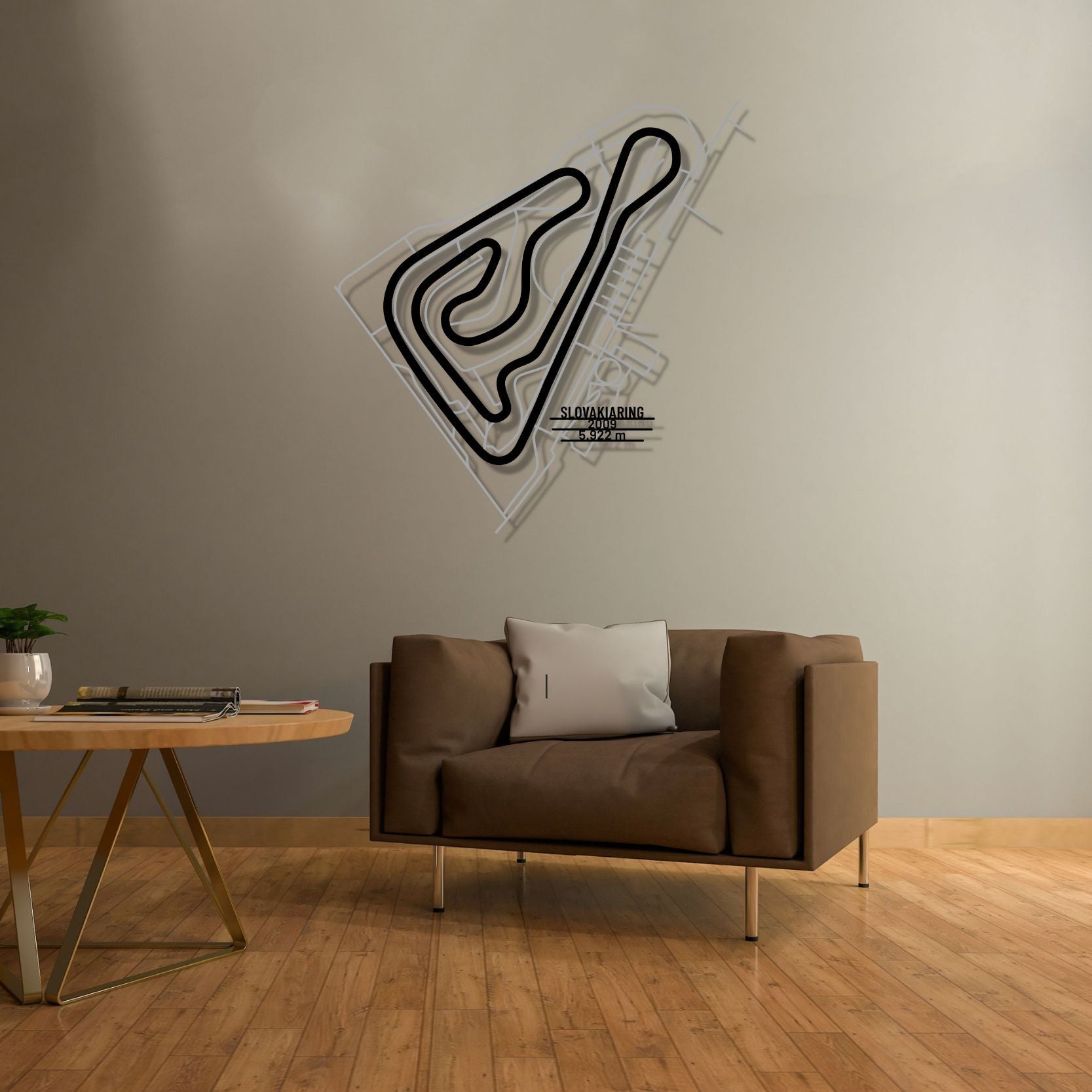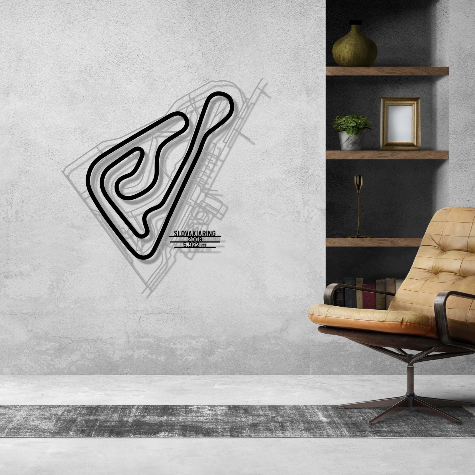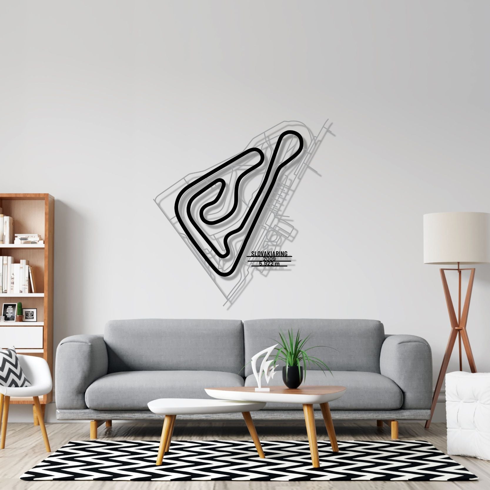 This Slovakia Ring metal Silhouette is our first multilayer and multicolor 3 piece wall art. It includes the track in our classic black finish and the surrounding area in a shiny and sparkly gray color. To top it off, we attach a metal plate, with the name of the track, its distance and the date of construction. This masterpiece alone or in combination with any of our other products will give your office, room or garage a unique look that will catch the attention of any racing or car enthusiast and will add a subtle touch as well  motorsport spirit to your home's interior design.