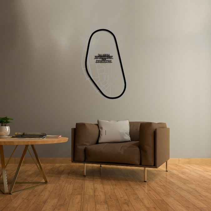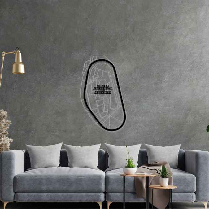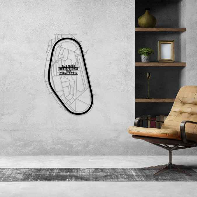 This Talladega Superspeedway metal Silhouette is a multilayer and multicolor 3 piece wall art. It includes the track in our classic black finish and the surrounding area in a shiny and sparkly gray color. To top it off, we attach a metal plate, with the name of the track, its distance and the date of construction. This masterpiece alone or in combination with any of our other products will give your office, room or garage a unique look that will catch the attention of any racing or car enthusiast and will add a subtle touch as well  motorsport spirit to your home's interior design.